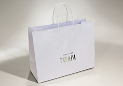 Sachetto in carta con risvolto e fondo quadro, prodotto in automatico da bobina o da foglio. Stampa in flessografia o offset. Manici in carta ritorta o cotone fissati con patch di rinforzo incollato all'interno del sacchetto e ricoperto dal risvolto sul lato superiore. Cartone di fondo disponibile su richiesta. Ns. riferimento "Mod. B".