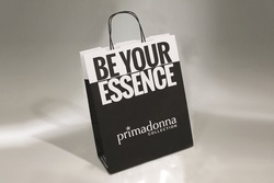 Sacchetto in carta senza risvolto e con fondo quadro, prodotto in automatico da bobina. Stampa in flessografia. Manici in carta ritorta o cotone fissati con patch di rinforzo incollato all'interno del sacchetto. Cartone di fondo disponibile su richiesta. Ns. riferimento "Mod A".