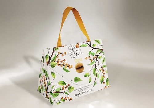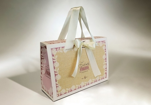 Bolsa de papel de alta gama con solapa. El cierre se realiza con un ojal en el centro de la solapa. Confección completamente manual. Impresión offset. Nuestra referencia "Mod.Patella Piramidal".